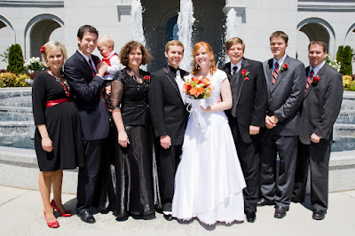 Dave's little sister Danielle got married yesterday in the Sacramento Temple.  This is Dave's immediate family (from left to right): Me, Dave, Charlie, his Mom - Diana, the groom - Jon, Danielle, his Dad - David, his younger twin brothers Devin and Cody.